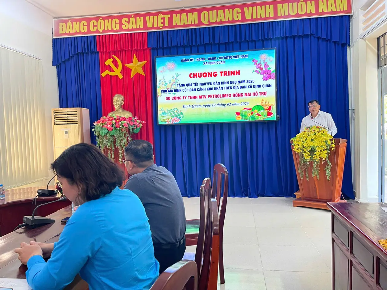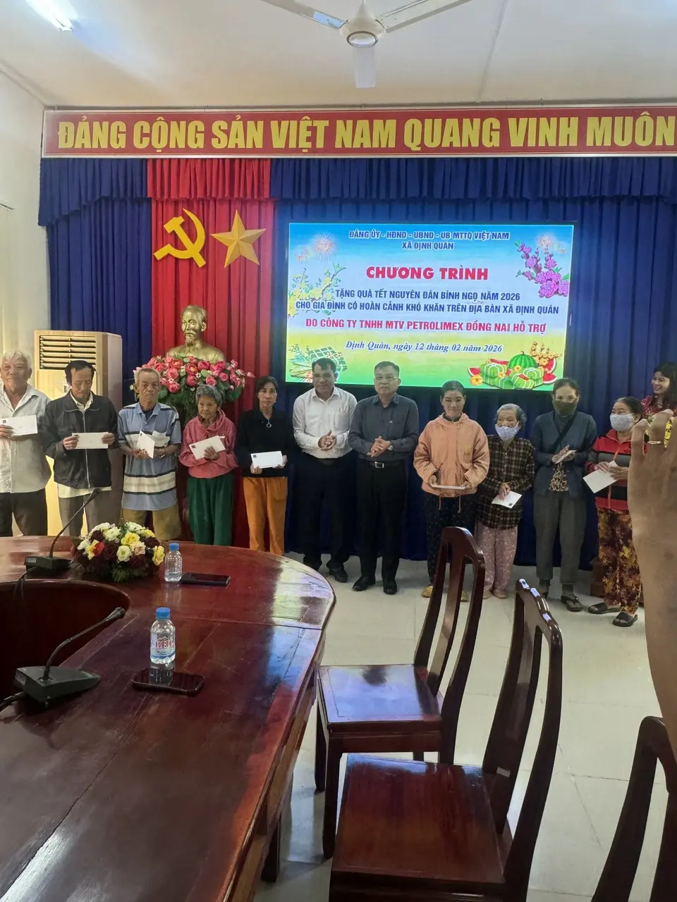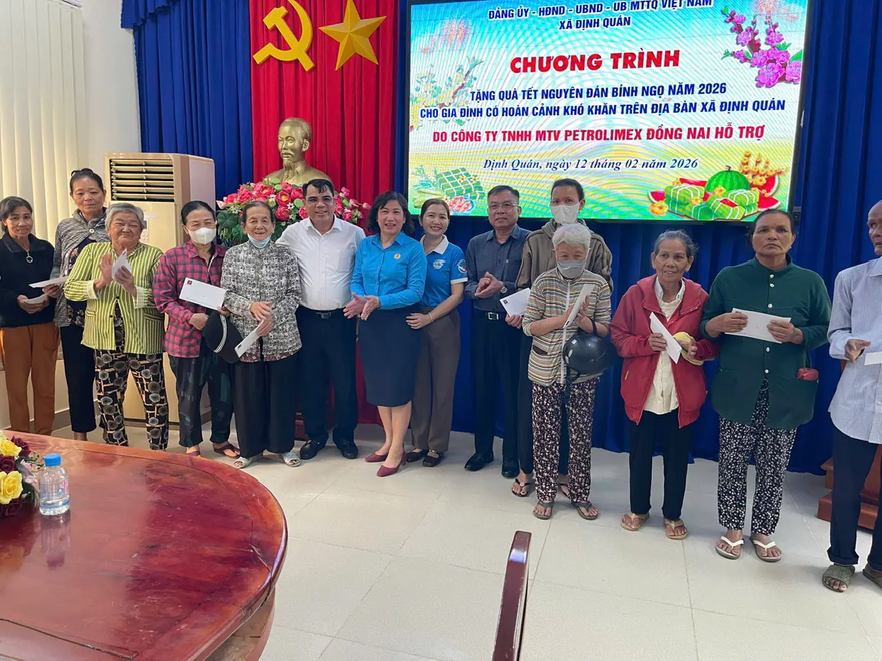 Tham dự buổi lễ vào sáng ngày 12/02/2026 có đại diện Đảng ủy, Công đoàn Công ty TNHH MTV Petrolimex Đồng Nai phối hợp với Đảng ủy, HĐND, UBND và MTTQ xã Định Quán tổ chức trao quà Tết Bính Ngọ năm 2026 cho 50 hộ nghèo, cận nghèo, hộ có hoàn cảnh khó khăn là đồng bào dân tộc thiểu số trên địa bàn xã.