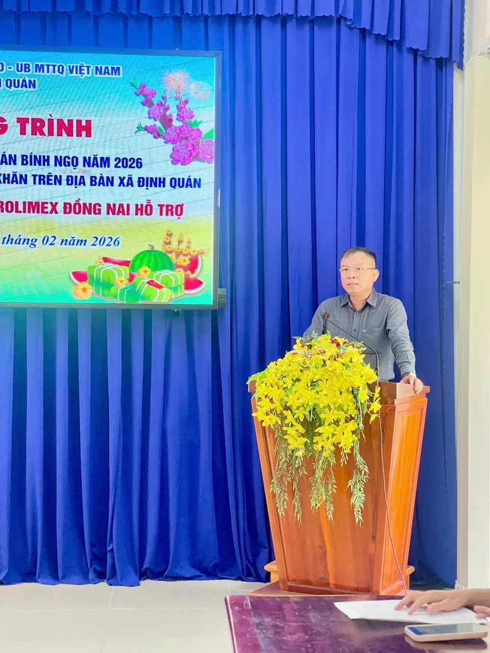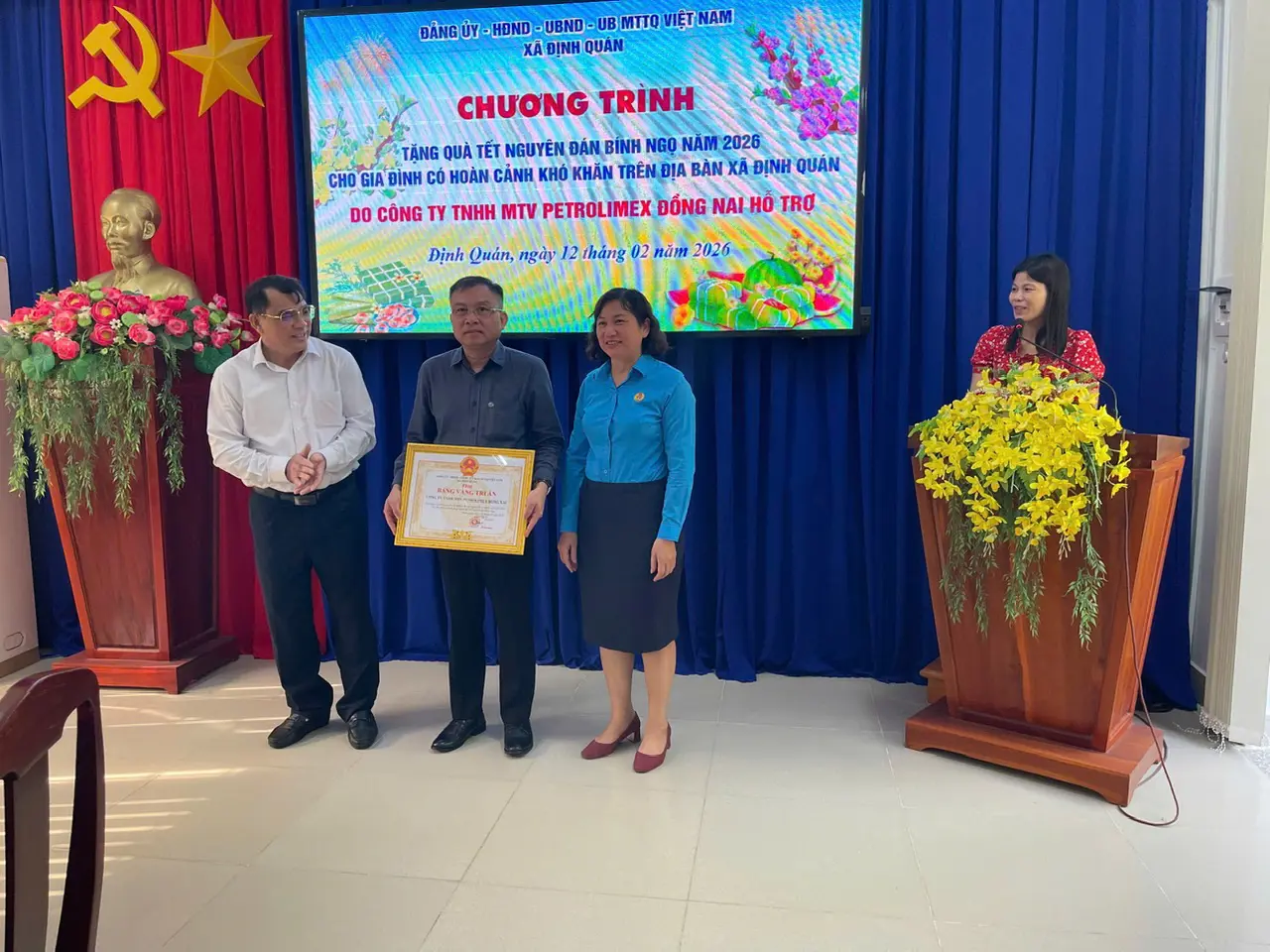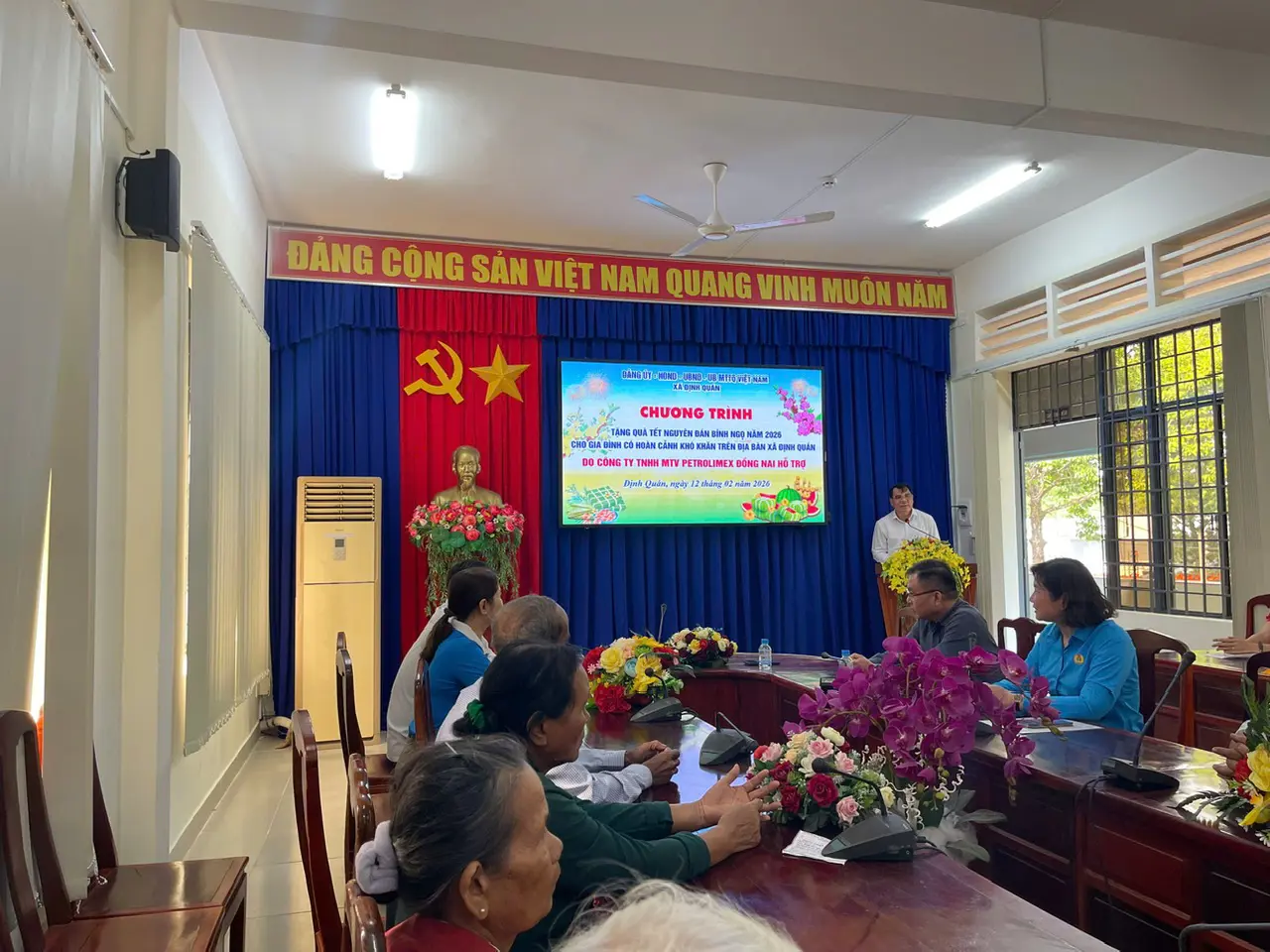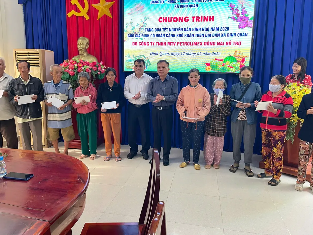Tham dự buổi lễ vào sáng ngày 12/02/2026 có đại diện Đảng ủy, Công đoàn Công ty TNHH MTV Petrolimex Đồng Nai phối hợp với Đảng ủy, HĐND, UBND và MTTQ xã Định Quán tổ chức trao quà Tết Bính Ngọ năm 2026 cho 50 hộ nghèo, cận nghèo, hộ có hoàn cảnh khó khăn là đồng bào dân tộc thiểu số trên địa bàn xã.